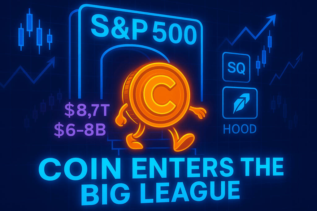 Beginning 19 May, Coinbase Global (COIN) replaced Discover Financial Services in the S&P 500, becoming the first pure-play crypto company in America’s premier stock benchmark. Funds tracking the index — roughly $8.7 trillion in passive capital — must now purchase COIN shares to maintain weight parity, injecting fresh liquidity and normalizing crypto exposure in traditionally conservative portfolios.
